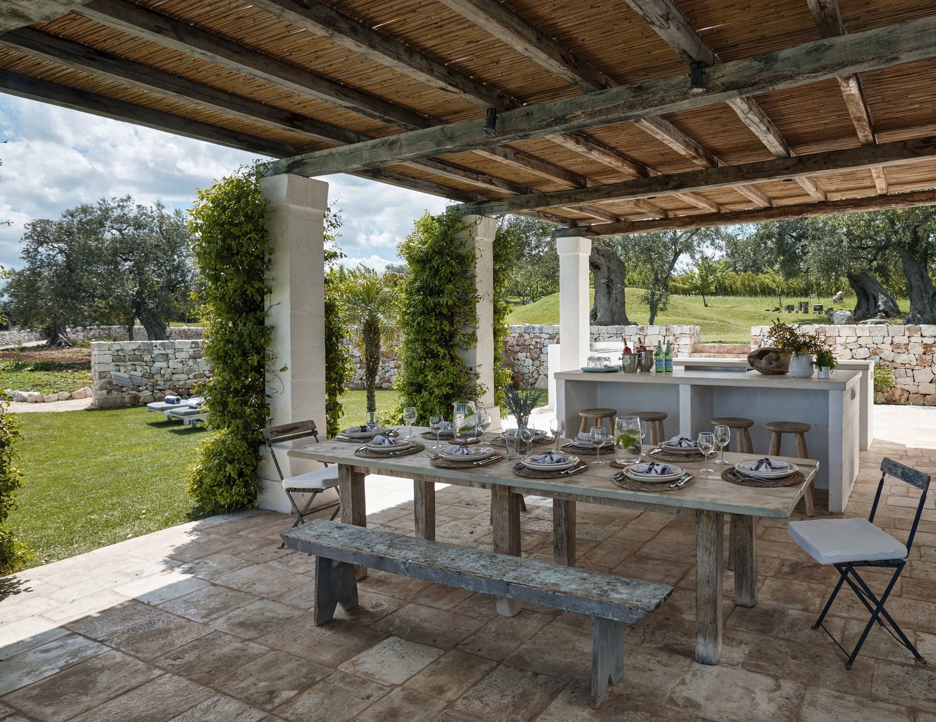 La terrazza di primo livello fuori dall’entrata superiore della Masseria poggia su quello che un tempo era il ponte levatoio. Questa terrazza può ospitare dai 10 ai 12 persona con una vista rialzata sull’oliveto, sul vigneto e sul mare oltre.